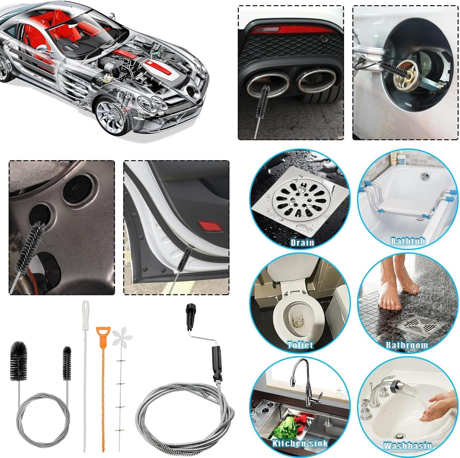 - Breite Anwendung: Die Abflussreiniger Spirale eignet sich für Abflusssysteme wie Küchen, Badezimmer, Badewannen, Toiletten, Bodenabläufe usw., um Verstopfungen schnell zu beseitigen. Die doppelköpfige Rohrreinigungsbürste eignet sich für schmale Rohre wie Aquarienfilter, Fischtanks, Waschmaschinen, Kaffeemaschinen, Kühlschrankabflüsse, Auto-Schiebedachabflüsse usw. Sie kann Schmutz und Verstopfungen effizient entfernen und so eine Vielzahl von Reinigungsanforderungen erfüllen.